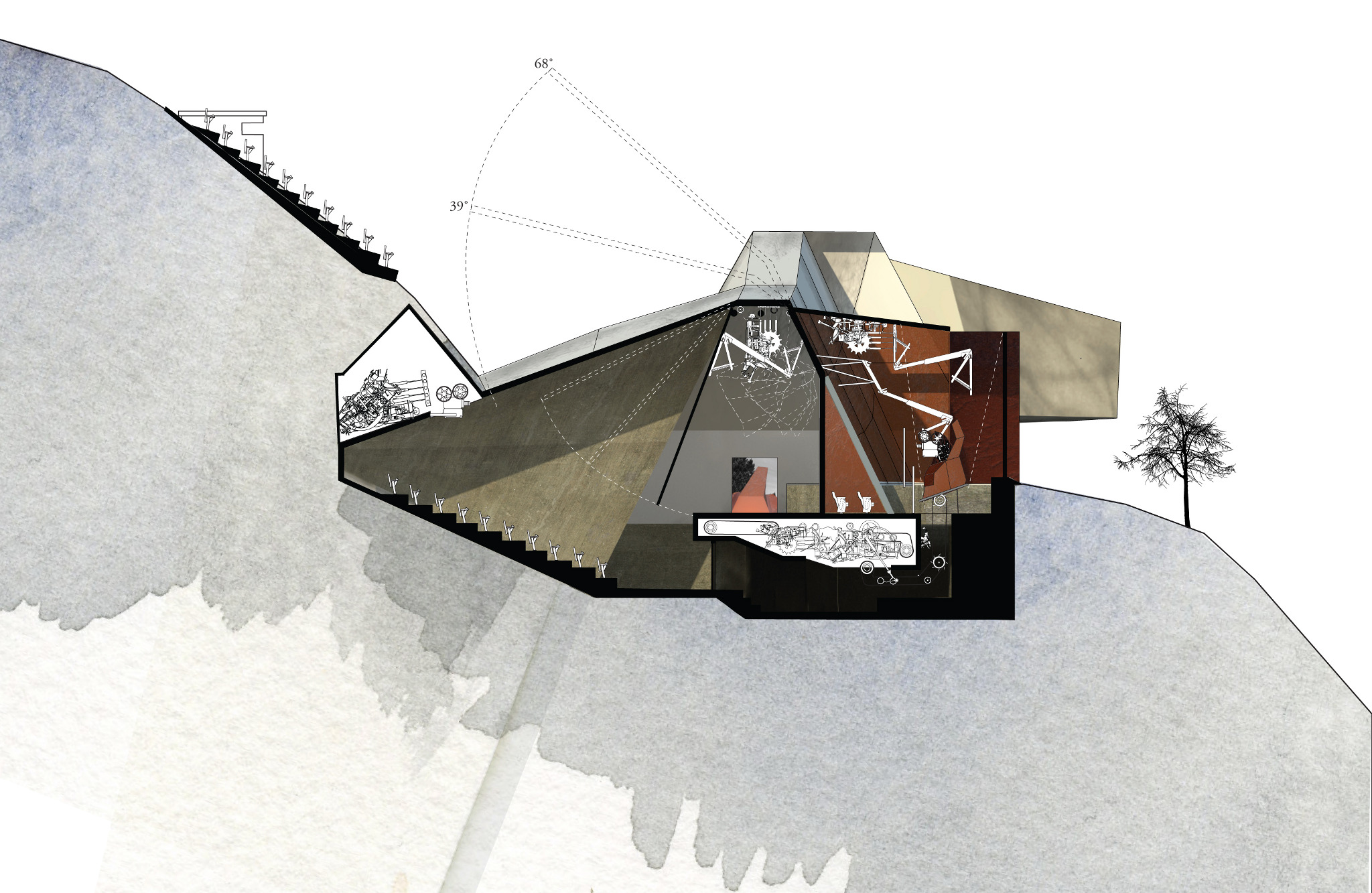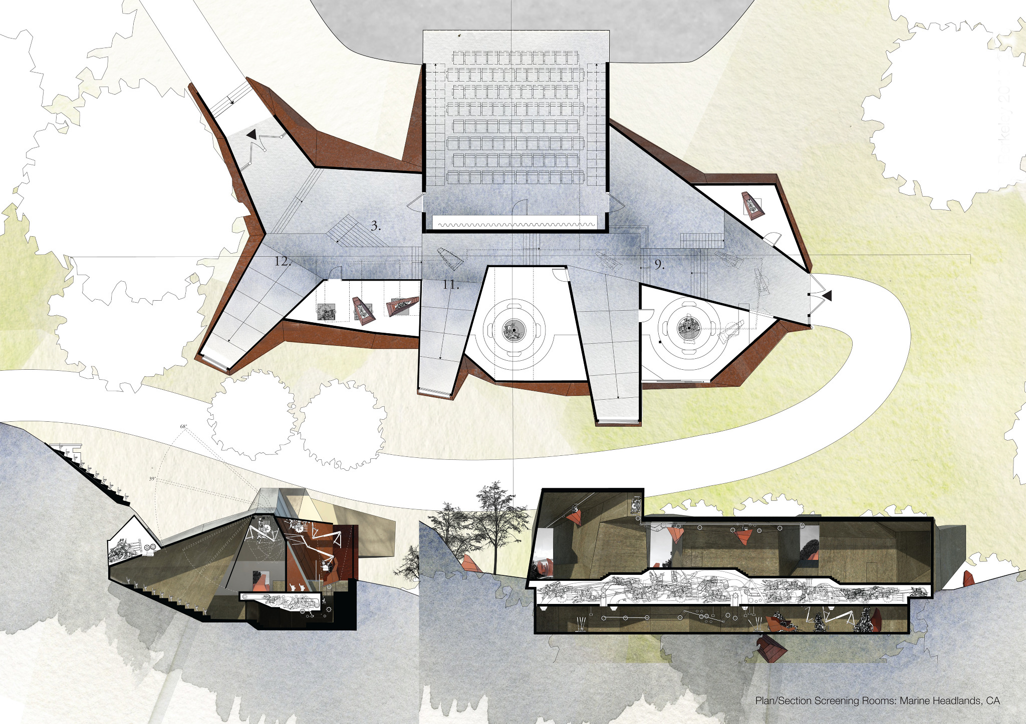 The project investigates memories as physical objects, through the proposal of a necropolis for dead film formats. By turning the traditional film archive inside out and exposing the artifacts of films in a garden landscape setting, a new kind of archival experience is created. The new Pacific Film Archive is a series of grave-yards for dead formats, spreading across the Marin Headlands outside of San Francisco, CA. Using the spatial patterns of the picturesque English landscape garden, the film tombstones are placed in the landscape as follies, creating a continuous sequence of spaces, blurring the border between outdoor and indoor spaces.